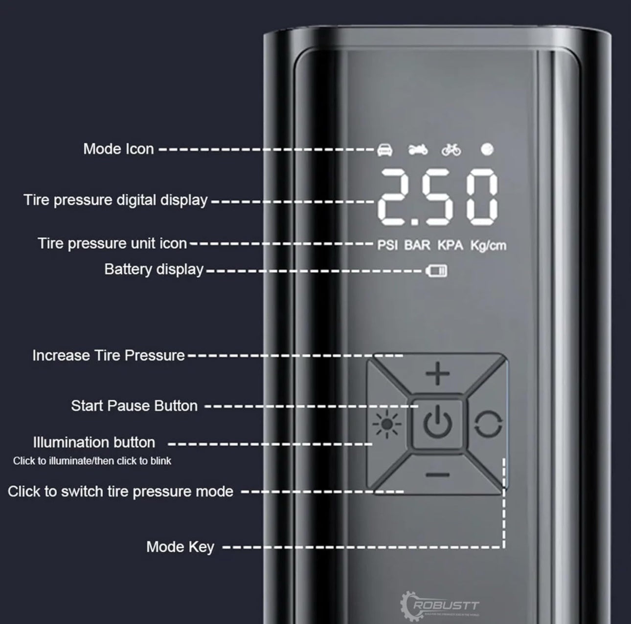 • Smart Instant Modes & Manual mode: The Robustt Car Air Pump offers 4 preset inflation modes for bicycles, motorcycles, cars and balls, with an auto shut off when the preset value is reached. The manual mode allows you to set pressure value (3-150psi) according to the inflation object.