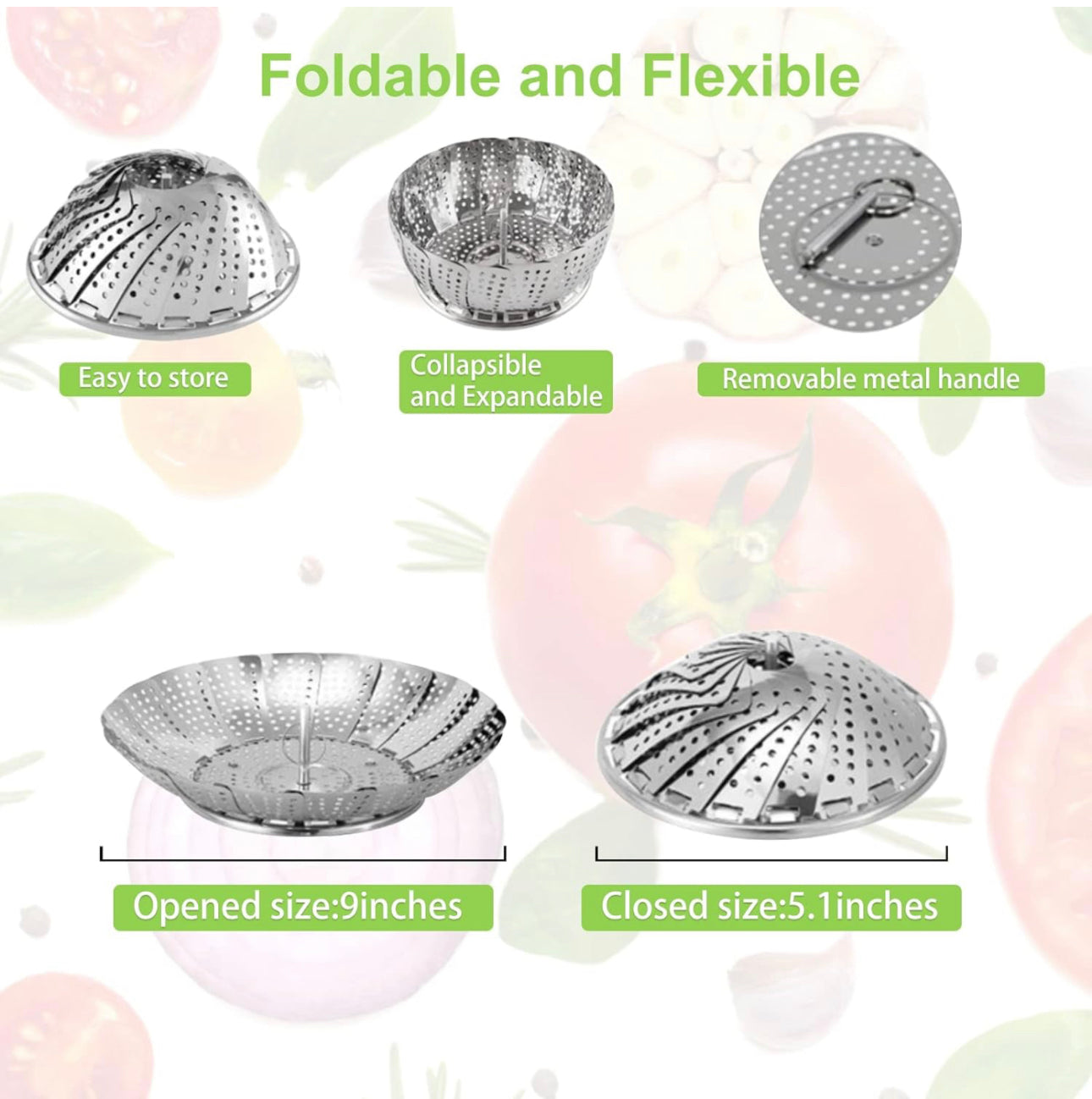 - ✅【SIZE FIT ANY POT】Jemyda steamer basket is collapsible and expandale from 5 inches to 9 inches, thus fit various pot/pan sizes or pressure cooker. This steamers for cooking opens like a water lily and it folds compactly to save storage space, it is much flexible and convenient than bulky bamboo steamers.